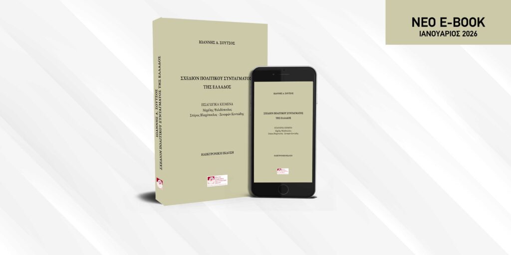 Το Κέντρο Ευρωπαϊκού Συνταγματικού Δικαίου – Ίδρυμα Θεμιστοκλή και Δημήτρη Τσάτσου και το e-ΠΟΛΙΤΕΙΑ παρουσιάζουν, σε μορφή e-book ελεύθερης πρόσβασης, το κλασικό έργο του Ιωάννη Σούτσου, με τίτλο «Σχέδιον Πολιτικού Συντάγματος της Ελλάδος», με Εισαγωγικά Κείμενα των Μιχάλη Ψαλιδόπουλου, Ομότιμου Καθηγητή Οικονομικής Ιστορίας του ΕΚΠΑ, Σπύρου Βλαχόπουλου, Καθηγητή Νομικής Σχολής ΕΚΠΑ, και Ξενοφώντα Κοντιάδη, Καθηγητή Δημοσίου Δικαίου στο Πάντειο Πανεπιστήμιο.