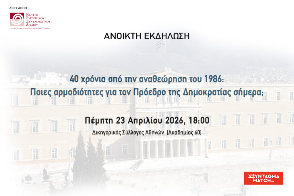 Ανοικτή Εκδήλωση: 40 χρόνια από την αναθεώρηση του 1986: Ποιες αρμοδιότητες για τον Πρόεδρο της Δημοκρατίας σήμερα;