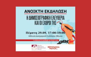 Αύριο, Πέμπτη 29 Σεπτεμβρίου 2022 και ώρα 17:00-19:00, το Κέντρο Ευρωπαϊκού Συνταγματικού Δικαίου – Ίδρυμα Θεμιστοκλή και Δημήτρη Τσάτσου, σε συνεργασία με το Syntagma Watch, διοργανώνουν δημόσια συζήτηση για τα εμπόδια στην ελεύθερη δημοσιογραφία και την επίδρασή τους στην άσκηση του δημοσιογραφικού λειτουργήματος και την ποιότητα της ενημέρωσης, με θέμα “Η δημοσιογραφική ελευθερία και οι εχθροί της”.